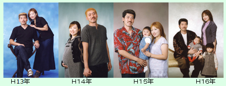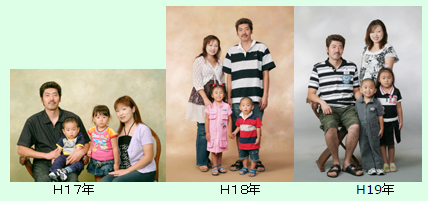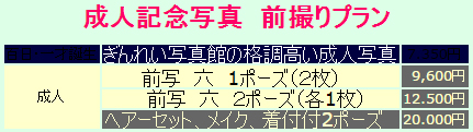 ホームページ移転しました ▼新しいホームページへはこちらから▼ 新ホームページ 格式高い記念写真をお撮りします。各税別 六切 2枚1組 9.600円八切 2枚1組 8,000円K 2枚1組 6,500円 ▼ご家族写真、結婚記念日、紙婚式(一年目)から毎年お撮り頂いているお写真例 ●百日●お誕生日●七五三●入学●卒業●成人●お見合い●家族●叙勲●長寿●ご葬儀●他 成人記念写真 成人式 当日プラン 六切 1ポーズ 2枚 1面台紙 12,000円 六切 2ポーズ(各1)2面台紙 14,000円 六切 3ポーズ(各1)3面台紙 18,000円成人式当日 ヘアーセット、着付 写真パック 六切2ポーズ 25,000円 ☆事前店頭予約(内金)の場合割引があります。