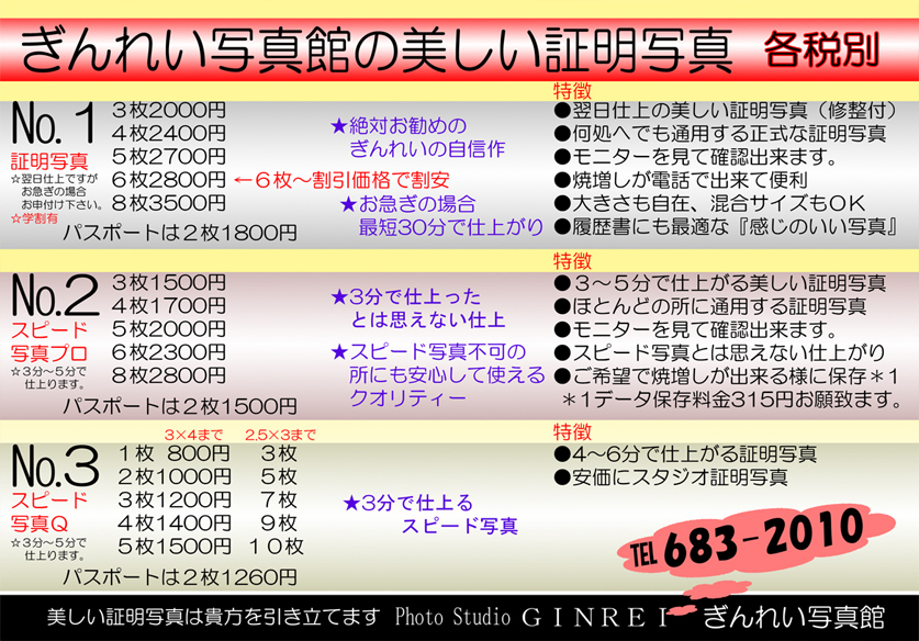 ホームページ移転しました ▼新しいホームページへはこちらから▼ 新ホームページ あなたを証明する大切な写真 価格は800円より、写真の内容、グレード、サイズにより色々ご用意。 仕上げ時間も3分程度のものから翌日仕上げの物まで3種類あります。 ☆いずれも、写真館品質で安心して使用できます。